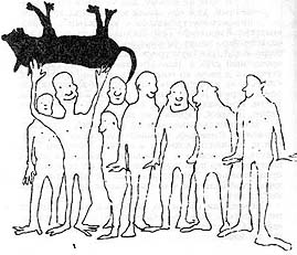 "Užeikite gi, bičeliai, bachūriukai ir draugeliai", - pasveikino juos Rendolfas, švypsodamasis nuo ausies iki gerklės. Na, jie ir įvirto, juokuodami ir šaukdami: "Linksmų Kaldiedų, Krendolfai", - garsiai ir širdingai, o po to užpuolė jį ir kad ims tąsyti, trankyti per makaulę, kalbėdami: "Niekada mes ir nemylėjome tavęs, asile tu, ir ko tu prie mūsų prisikabinai, mulki…". Žodžiu, jie užmušė jį, matot, bet kita vertus, negalima juk pasakyti, kad pasimirė jis vienišas, tiesa? Laimingų Kalėdų tau, Rendolfai, prieteliau mūsų! " (p. 31).