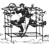 Vis dėlto, vienas iš pačių linksmiausių skyrių - tai skyrius "Apie namų židinį". Et, ir ko ten nėra: pvz., patentuotas ūsų saugiklis, įrenginys knarkliui nutildyti, laikrodžio mechanizmo varomas dantų šepetukas, vilgomasis žiebtuvėlis. Apie jį truputį plačiau: "vilgomųjų žiebtuvėlių savininkai nešiodavosi stiklinaitę su koncentruota sieros rūgštimi ir lanką su pagaliukais, kurių vienas galas iš pradžių mirkomas į sierą, paskui į kalio chlorato ir cukraus mišinį. Suvilgytas rūgštimi pagaliukas užsidegdavo" - kaip matote, labai patogu, modernu ir šiuolaikiška. Mažiau turtingi rūkoriai žiebtuvėlį galėjo pasigaminti ir iš... paprasčiausio pjūklo! Taigi, "du gabaliukai seno pjūklo arba panašios metalinės juostelės lygiagrečiai pritvirtinami ant izoliuoto pagrindo prie pat vienas kito. Į metalinę tūtą įkišamas šiek tiek kyšantis dagtis, suvilgytas benzinu arba kitu lengvai užsidegančiu skysčiu. Juosteles sujungus su įtampos šaltiniu, o tūta braukiant per jųtarpą šokdavo kibirkštys, kurios uždegdavo dagtį". Deja, išjungus elektros srovę neveikdavo ir žiebtuvėlis... Jeigu jau tiek dėmesio skyrėme kibirkštims, tai gal pabaigai paminėsim ir išradimą, kuris mylimuosius įtikindavo, kad meilė tarp jų tikrai kibirkščiuoja. Viskas vėlgi labai paprasta: atsimenate mokyklose buvusias elektrostatinės trinties mašinas, kai pasukus rankeną tarp dviejų metalinių rutulių imdavo kibirkščiuoti? Taigi, jas galima panaudoti ir praktiškiau, ir romantiškiau (1880 metai): "vienas partneris užsilipdavo ant izoliacinio suolelio, kitas stovėdavo ant grindų - taip "įžeminama". Įjungus elektrostatinę trinties mašiną ir izoliuotai partnerei palietus laidininką, tarp jos ir mylimojo šokinėdavo kibirkštis, galimas daiktas, tarp nosių, kurios kaip elektrodai buvo arčiausiai." Kartais tokie eksperimentai būdavo ir ne itin malonūs: "Vienas didžiūnas sugalvojo tokį variantą: išrikiuotus rankomis susikibusius grenadierius jis sujungdavo su Leideno stiklinių baterijos poliais. Jo didenybei būdavo gražu, kad grenadieriai trūkčioja". Taigi, kartais tai ne tik knyga, bet nesibaigiantys technikos anekdotai.